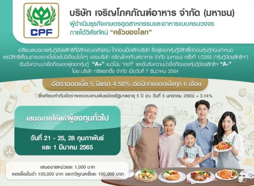บมจ.เจริญโภคภัณฑ์อาหาร (CPF) เตรียมเสนอขายหุ้นกู้ด้อยสิทธิที่มีลักษณะคล้ายทุน อัตราดอกเบี้ยใน 5 ปีแรก อยู่ที่ 4.50% ต่อปี ให้กับผู้ลงทุนทั่วไประหว่างวันที่ 21-25, 28 ก.พ.และ 1 มี.ค. 65